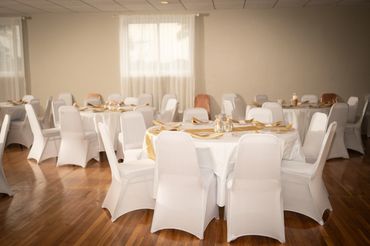 Our chair covers fit most banquet chairs and folding chairs Available in white or black, wrinkle free, no ironing required. $2.00 per seat cover. Chair covers are guaranteed to arrive a day in advance and ready to go. For more information please reach out to our event planning team.